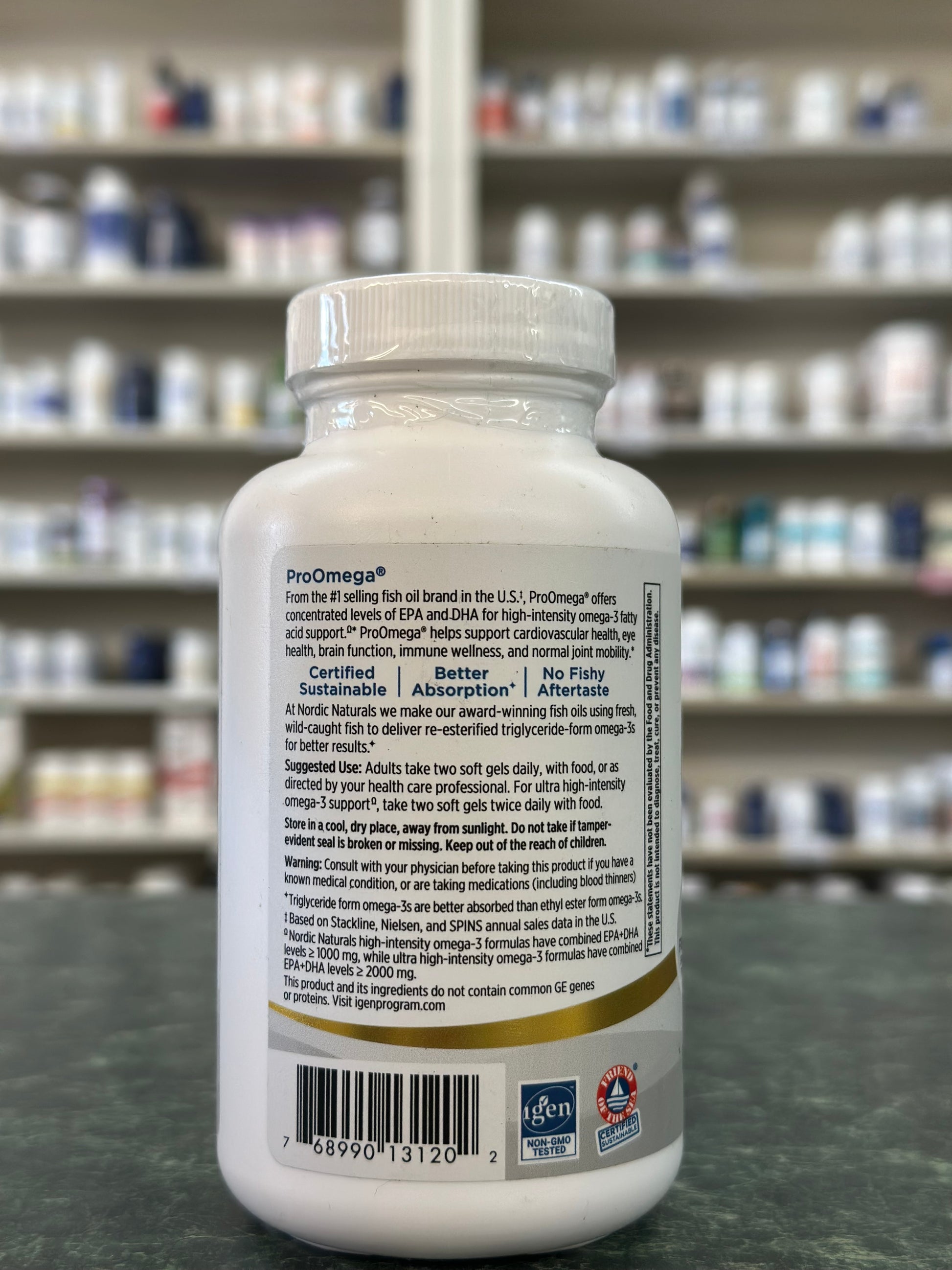 Ideal for pesco-vegetarians, ProOmega in fish gelatin soft gels is a double strength EPA+DHA formula for more omega-3 benefits in fewer servings. For high intensity, therapeutic support for both body and mind, ProOmega is an excellent choice, containing 1100 mg EPA+DHA per serving.
